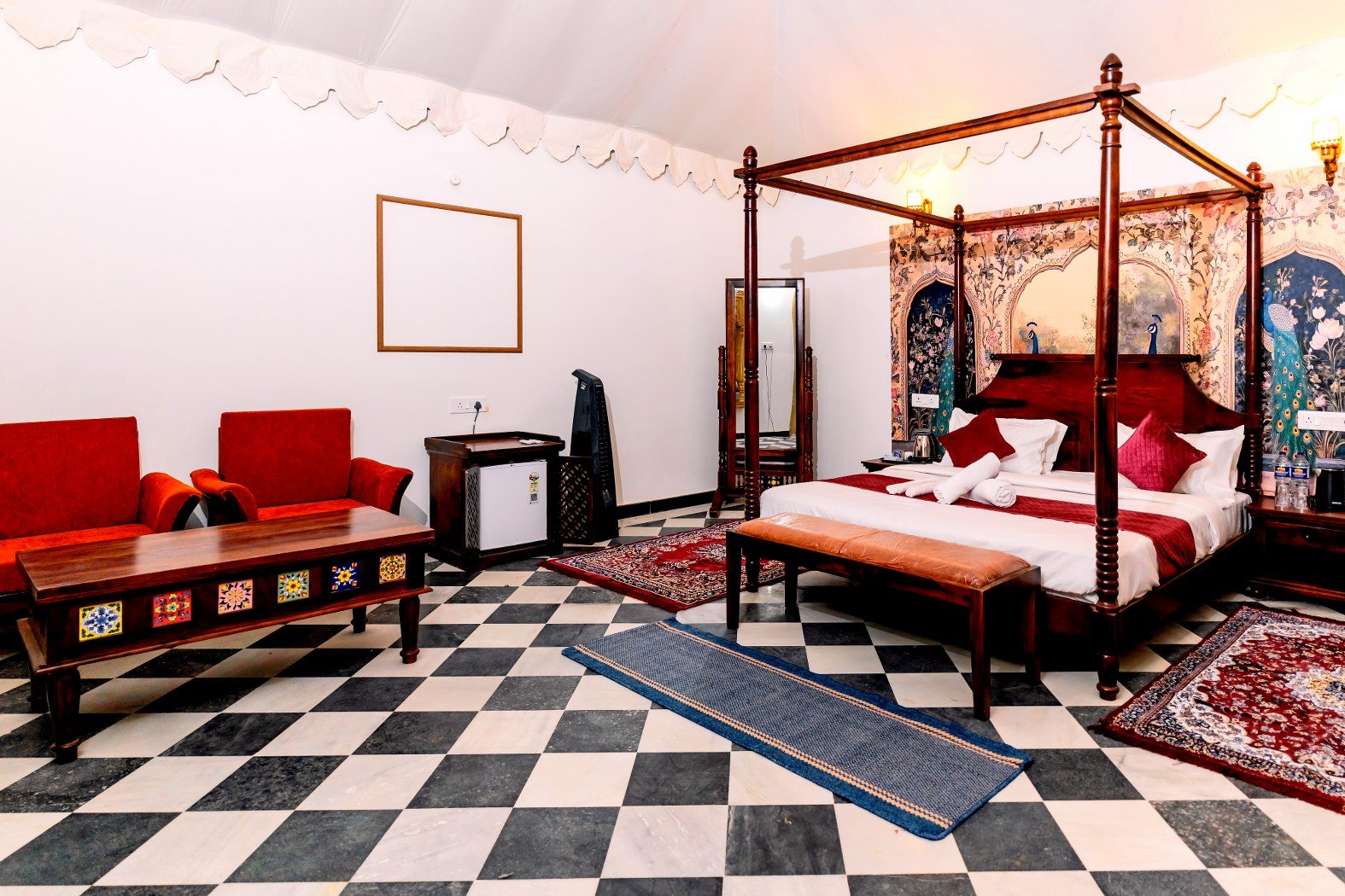 The Luxury Swiss Tents at Marubhumi are meticulously designed to offer the rustic charm of a traditional desert camp complemented by all the amenities of a premium resort.